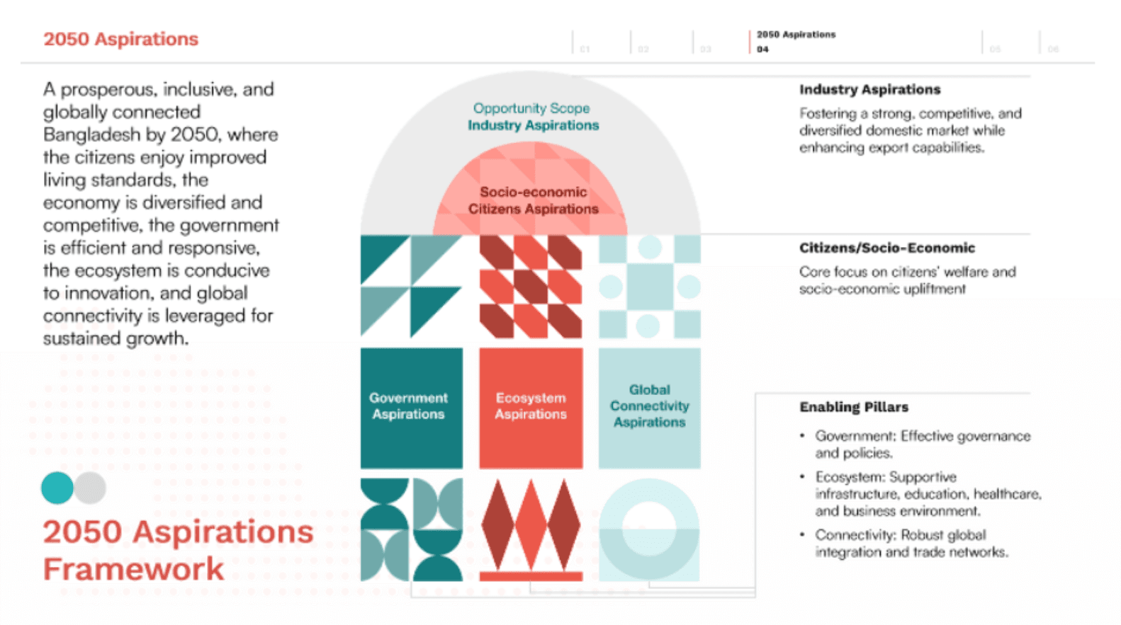 Consolidate Bangladesh’s position as a top-tier knowledge and creative-economy hub, achieve net-zero industrial clusters, and leverage international diplomatic clout to shape regional trade and climate regimes.