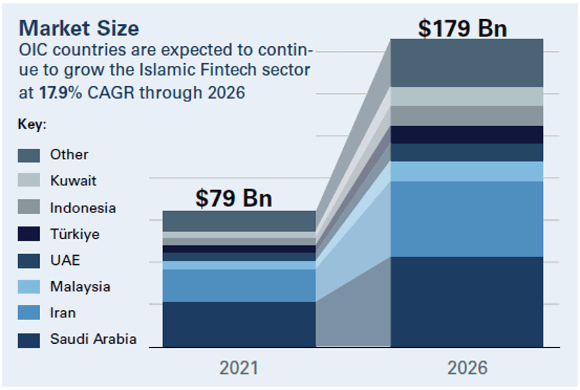 The global Islamic Fintech market is estimated at $79 billion in transaction volume (2021) and is expected to grow on average by 18% annually, to reach $179 billion by 2026.
