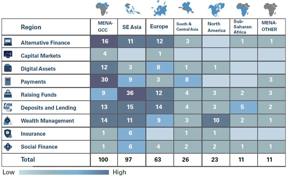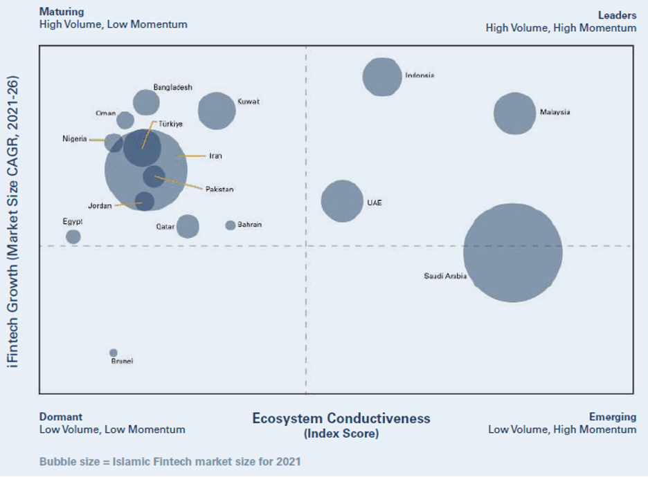 Malaysia, UAE and Indonesia are Leader Hubs, with Saudi Arabia moving from Emerging to Leaders. Bahrain, Bangladesh, Egypt, Iran, Jordan, Kuwait, Nigeria, Oman, Pakistan, Qatar and Türkiye are maturing with lower conduciveness to Islamic Fintech but display relatively high growth at the domestic level in market size.