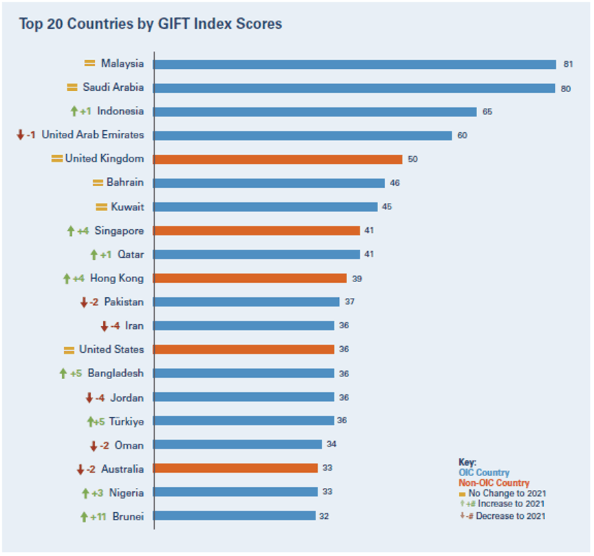 The GIFT Index ranked 64 country hubs on conduciveness for Islamic Fintech, with Malaysia and Saudi Arabia the standout jurisdictions, and Indonesia, the UAE and the UK forming the top five.