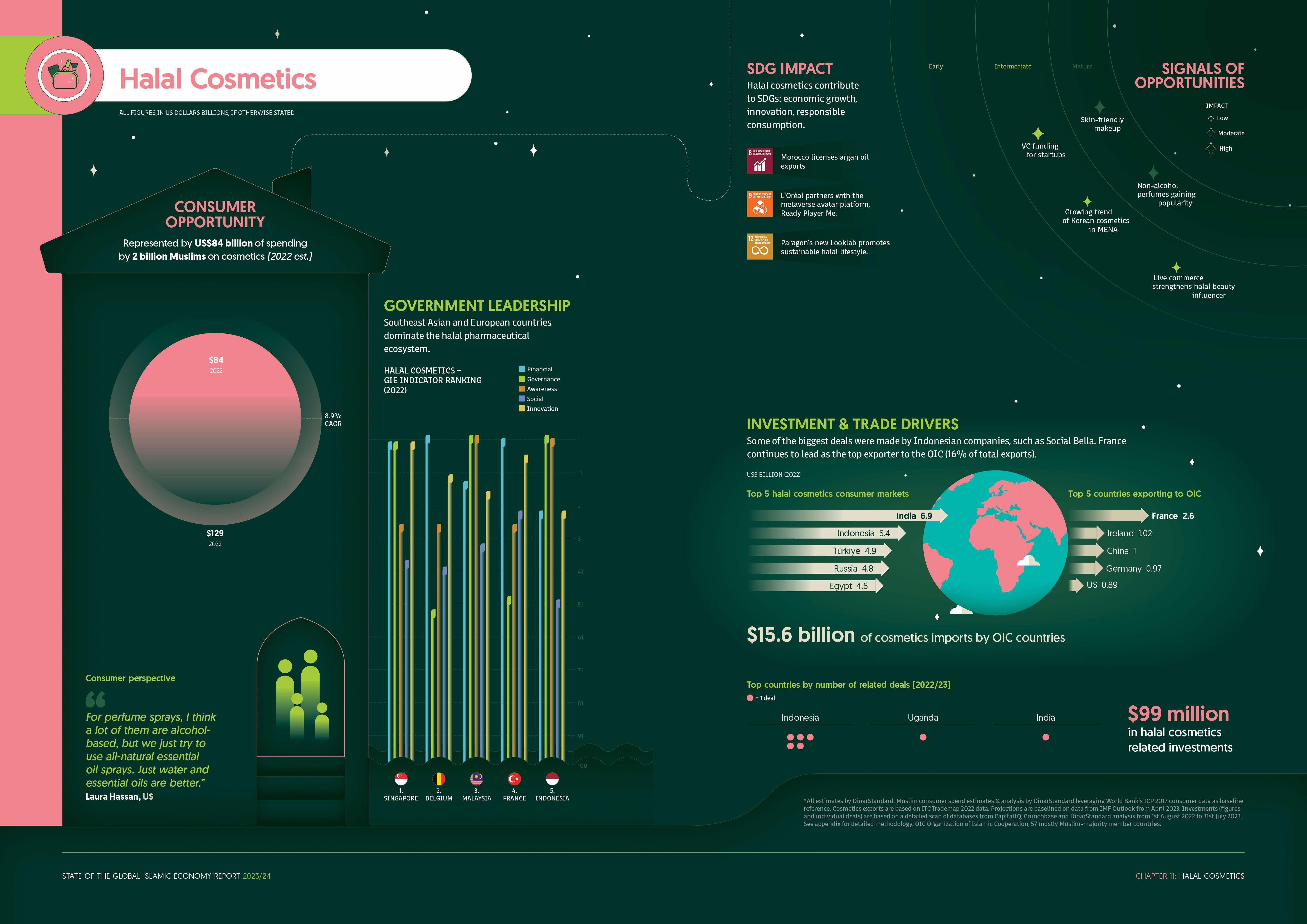 Import of halal-related products by the OIC member countries is set to grow at 7.6% CAGR to US$492 billion in 2027, with US$359 billion in 2022. Imports by OIC member countries represent a significant majority of halal products traded globally, which include food and beverage, fashion (apparel and footwear), pharmaceuticals, and cosmetics.